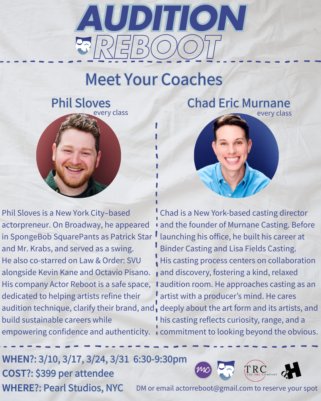 A three-class series led by Phil Sloves. Participants refine their go-to audition songs, add a new hand-picked piece to their book, and prepare callback material for roles they are most likely to be seen for. Previous guest artists include Tony nominees Rob McClure and Caitlin Kinnunen, Broadway veterans Kelvin Moon Loh, Fergie L. Philippe, Nicholas Edwards, Aneesa Folds, and Kuhoo Verma, as well as casting professionals Michael Cassara, Holly Buczek, Devi Peot, and more.